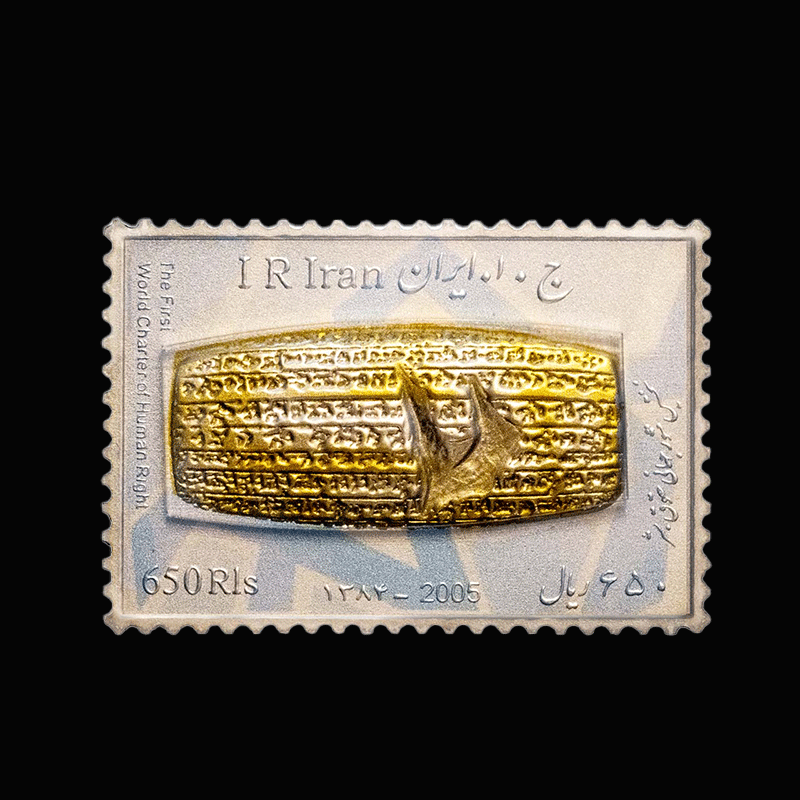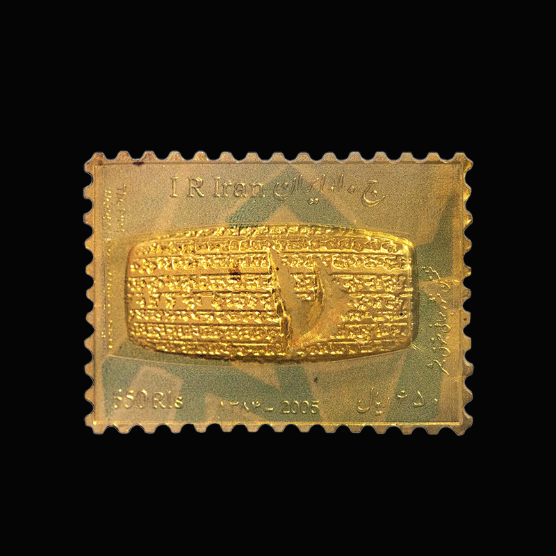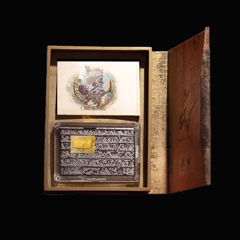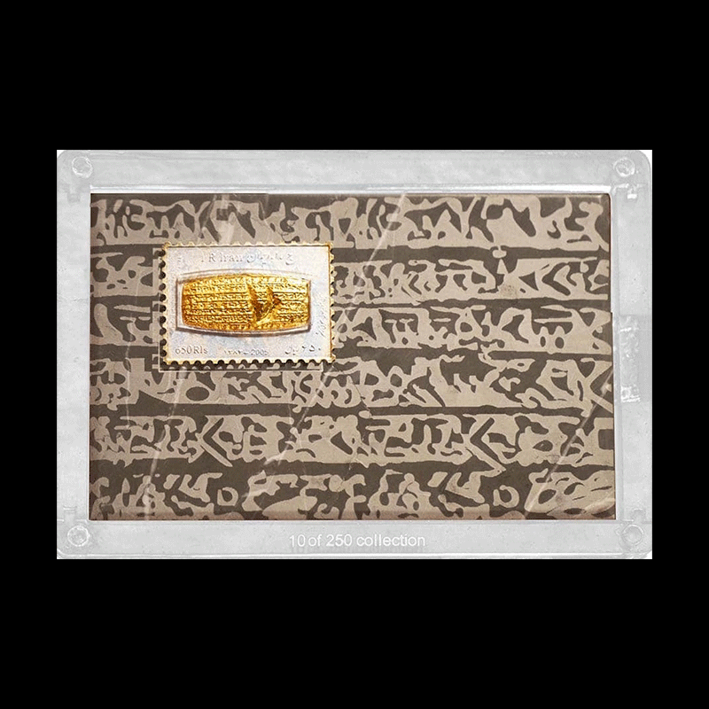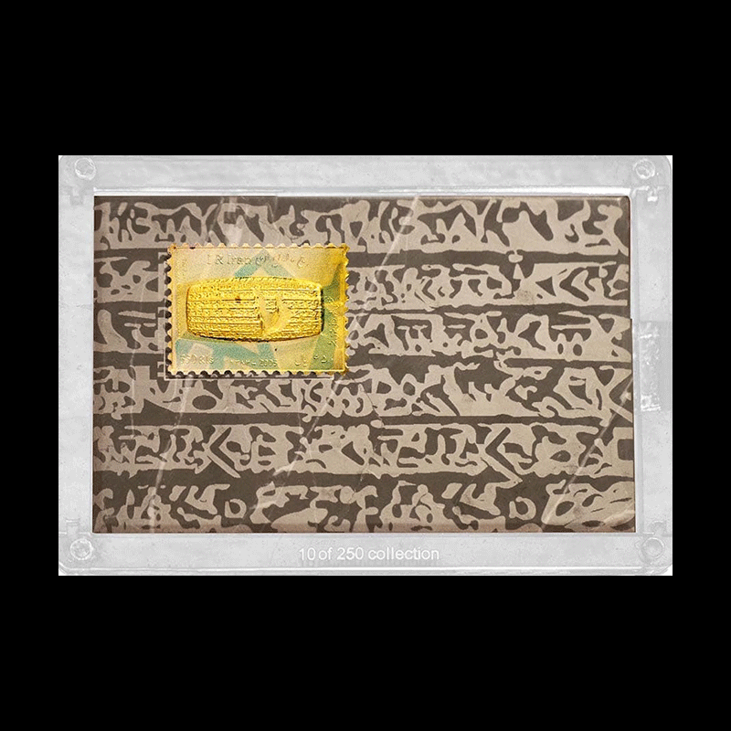 صنایع دستی پرنیا از مدت ها قبل در تهیه و تدارک تولید و ساخت محصولی فاخر برای این کتیبه با ارزش بوده است و در نهایت با همکاری شرکت ملی پست جمهوری اسلامی اقدام به طراحی و تولید تمبرینه های فاخر کلکسیونی طلا و نقره و بای متال کتیبه حقوق بشر کوروش کبیر نمود. تمبرینه کلکسیونی منشور کوروش ( شامل طلا ، نقره و بایمتال ) حاوی تمبرینه فاخر کلکسیونی طلا: ۱ گرم، تمبرینه فاخر کلکسیونی نقره: ۱۰ گرم و تمبرینه فاخر کلکسیونی بای متال: ۱ گرم طلا ۵ گرم نقره همراه با بسته بندی فاخر به شکل سنگ و پلکسی و جعبه می باشد. این محصول در آبان ماه 1398 در تیراژ 250 عددی تولید شده است.